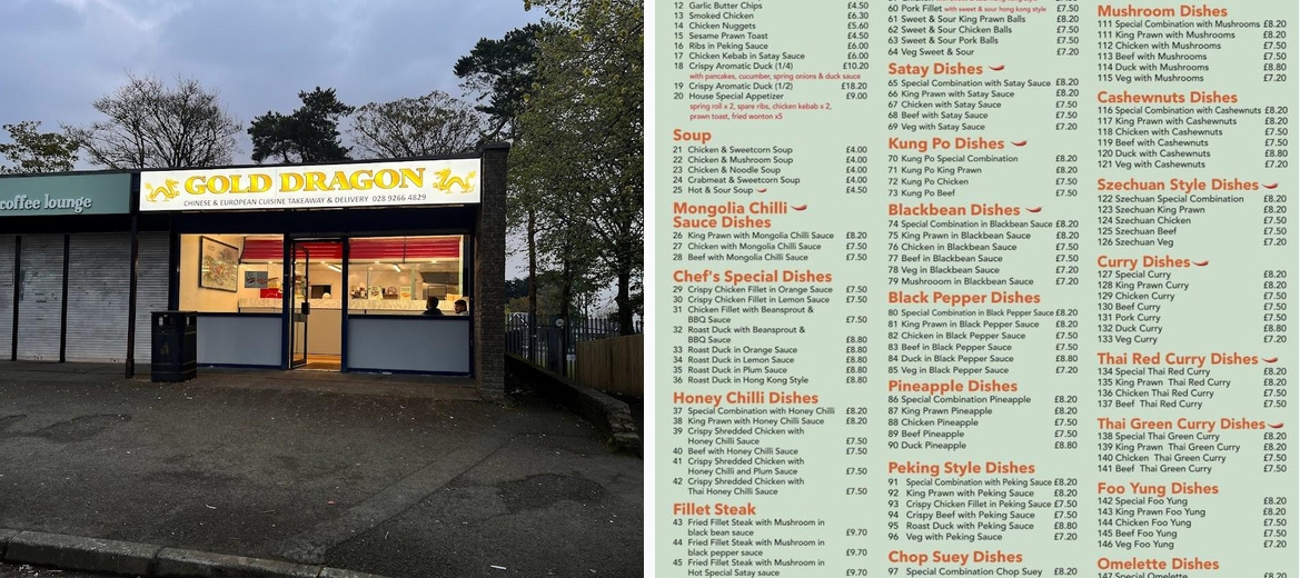 Discover Gold Dragon, your go-to Chinese takeaway in Harmony Hill Shopping Centre, Lisburn. We offer a delightful range of authentic dishes with options for everyone, including vegan and vegetarian selections. Whether you choose to dine in, take away, or enjoy delivery, our casual atmosphere and friendly service make every meal a pleasure. Enjoy quick bites or hearty dinners featuring favorites like curry, chow mein, and tender beef with rich sauces, all at reasonable prices. With wheelchair-accessible seating, free parking, and dog-friendly outdoor areas, Gold Dragon is perfect for solo diners and families alike. Join us for a taste of genuine Chinese cuisine!Customers frequently highlight the freshness and quality of the food. The beef curry and garlic chili chicken are fan favorites. The generous portions and consistent taste keep patrons coming back for more. People appreciate the affordability, especially with meal deals that add extra value, like a complimentary Fanta with large orders. Many also enjoy the crispy, fluffy chips, which are a delightful twist compared to standard takeaway offerings. The staff's friendliness and attention to detail play a key role in enhancing the overall dining experience.